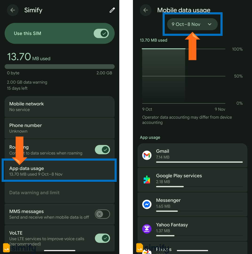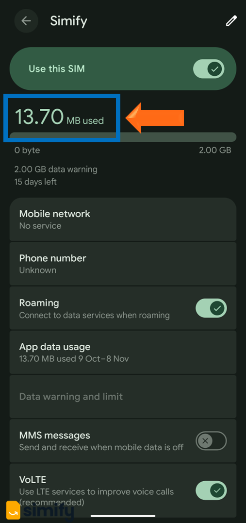Go to your phone's Settings ⚙️and tap on “Network & Internet”. You’ll see your active SIMs listed - go ahead and tap on your Simify eSIM so you can see how much data has been used for the current date range.