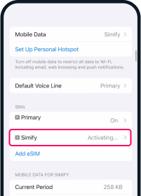 Select "Simify" as your mobile data line to ensure all internet usage runs through your eSIM.