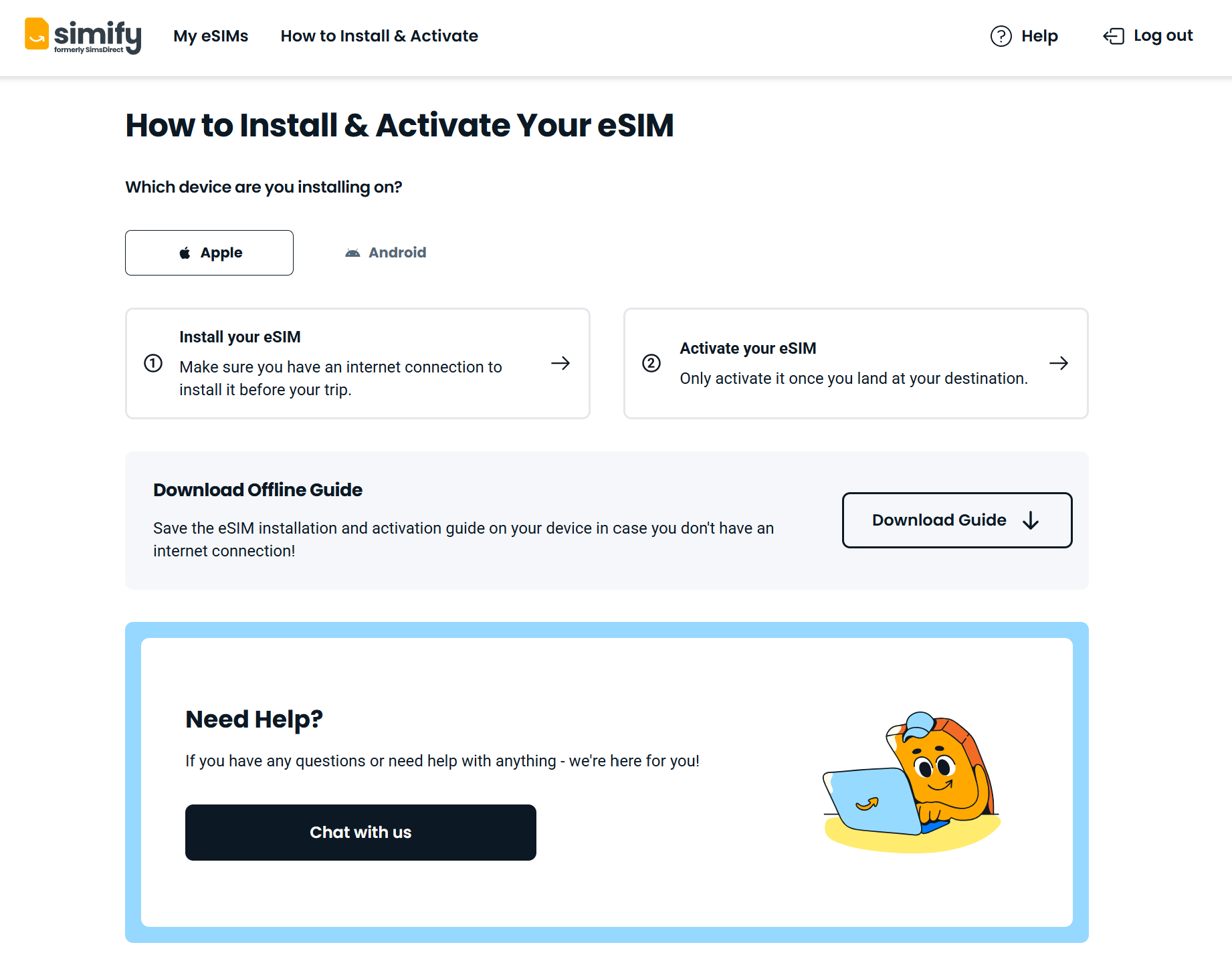 Inside the portal you'll also find a handy 'How to Install & Activate Your eSIM' section: